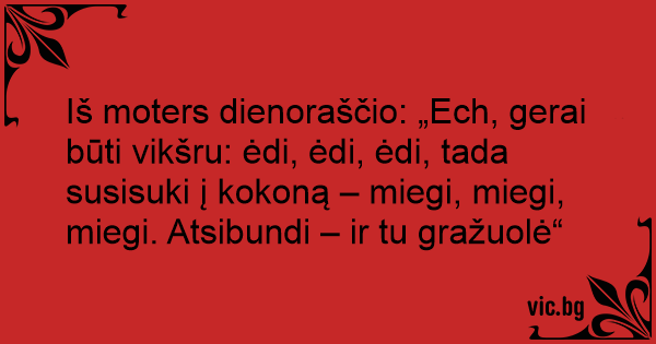 Iš moters dienoraščio: „Ech, gerai būti vikšru: ėdi, ėdi, ėdi, tada susisuki į kokoną – miegi, miegi, miegi. Atsibundi – ir tu gražuolė“