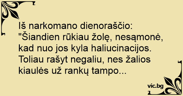 "Šiandien rūkiau žolę, nesąmonė, kad nuo jos kyla haliucinacijos. Toliau rašyt negaliu, nes žalios kiaulės už rankų tampo...