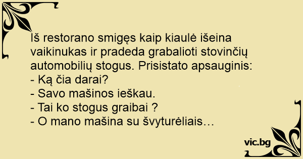 Iš restorano smigęs kaip kiaulė išeina vaikinukas ir pradeda grabalioti stovinčių automobilių stogus. Prisistato apsauginis:
