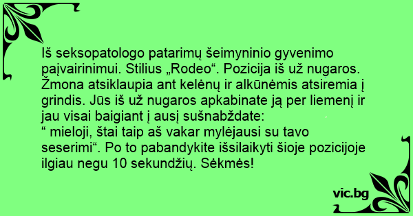Iš seksopatologo patarimų šeimyninio gyvenimo paįvairinimui. Stilius „Rodeo“. Pozicija iš už nugaros. Žmona atsiklaupia ant kelėnų ir alkūnėmis atsiremia į grindis. Jūs iš už nugaros apkabinate ją per liemenį ir jau visai baigiant į ausį sušnabždate: