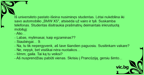 Iš universiteto pastato išeina nusiminęs studentas. Lėtai nukėblina iki savo automobilio „BMW X5″, atsisėda už vairo ir tyli. Suskamba telefonas. Studentas išsitraukia prašmatnų deimantais inkrustuotą mobilųjį: