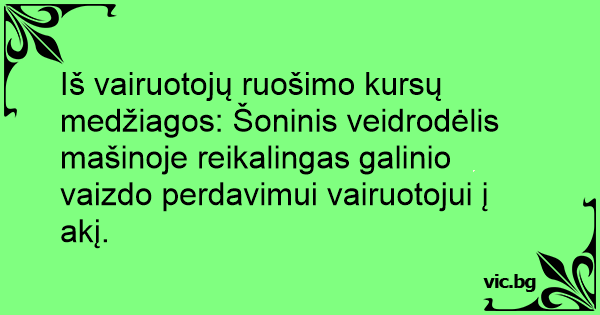 Iš vairuotojų ruošimo kursų medžiagos: Šoninis veidrodėlis mašinoje reikalingas galinio vaizdo perdavimui vairuotojui į akį.