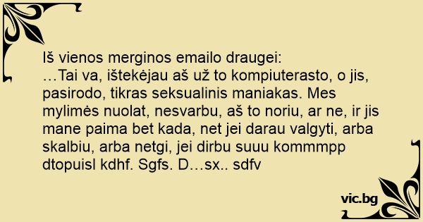 …Tai va, ištekėjau aš už to kompiuterasto, o jis, pasirodo, tikras seksualinis maniakas. Mes mylimės nuolat, nesvarbu, aš to noriu, ar ne, ir jis mane paima bet kada, net jei darau valgyti, arba skalbiu, arba netgi, jei dirbu suuu kommmpp dtopuisl kdhf. Sgfs. D…sx.. sdfv