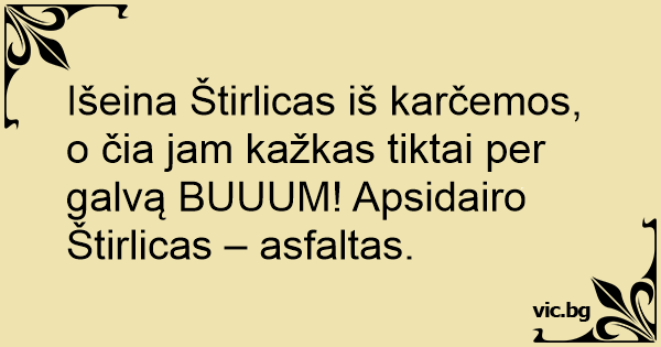 Išeina Štirlicas iš karčemos, o čia jam kažkas tiktai per galvą BUUUM! Apsidairo Štirlicas – asfaltas.
