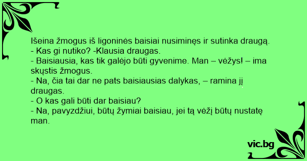 Išeina žmogus iš ligoninės baisiai nusiminęs ir sutinka draugą.