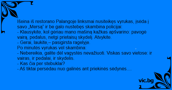 Policininkas sustabdo vairuotoją. Policininkas: - Sveikiname, Jūs laimėjote 1 000 litų, ką su jais darysite? Vairuotojas: - Manau, išsilaikysiu egzaminus vairuotojo pažymėjimui gauti. Žmona: -...
