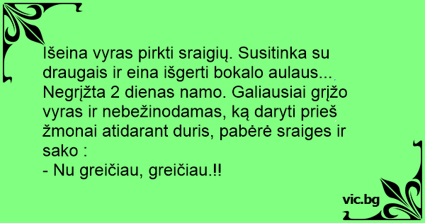 Išeina vyras pirkti sraigių. Susitinka su draugais ir eina išgerti bokalo aulaus... Negrįžta 2 dienas namo. Galiausiai grįžo vyras ir nebežinodamas, ką daryti prieš žmonai atidarant duris, pabėrė sraiges ir sako :