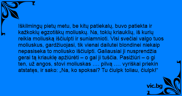 Iškilmingų pietų metu, be kitų patiekalų, buvo patiekta ir kažkokių egzotiškų moliuskų. Na, tokių kriauklių, iš kurių reikia moliuską iščiulpti ir suniamnioti. Visi svečiai valgo tuos moliuskus, gardžiuojasi, tik vienai dailutei blondinei niekaip nepasiseka to moliusko iščiulpti. Galiausiai ji nusprendžia gerai tą kriauklę apžiūrėti – o gal ji tuščia. Pasižiūri – o gi ten, už angos, stovi moliuskas …. pilvą …. vyriškai priekin atstatęs, ir sako: „Na, ko spoksai? Tu čiulpk toliau, čiulpk!“