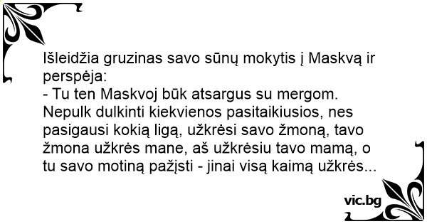 - Tu ten Maskvoj būk atsargus su mergom. Nepulk dulkinti kiekvienos pasitaikiusios, nes pasigausi kokią ligą, užkrėsi savo žmoną, tavo žmona užkrės mane, aš užkrėsiu tavo mamą, o tu savo motiną pažįsti - jinai visą kaimą užkrės...