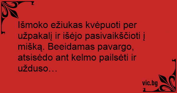 Išmoko ežiukas kvėpuoti per užpakalį ir išėjo pasivaikščioti į mišką. Beeidamas pavargo, atsisėdo ant kelmo pailsėti ir užduso…