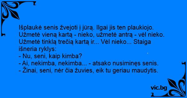 - Žinai, seni, nėr čia žuvies, eik tu geriau maudytis.