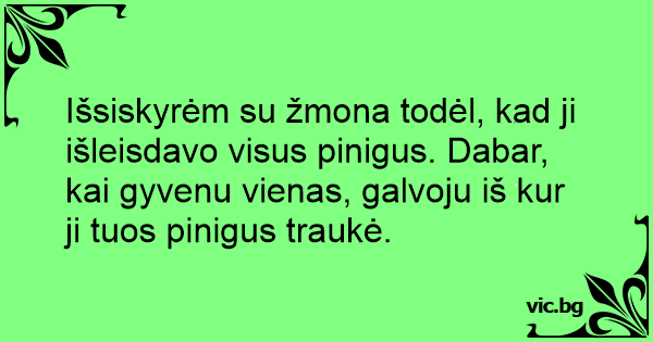 Išsiskyrėm su žmona todėl, kad ji išleisdavo visus pinigus. Dabar, kai gyvenu vienas, galvoju iš kur ji tuos pinigus traukė.