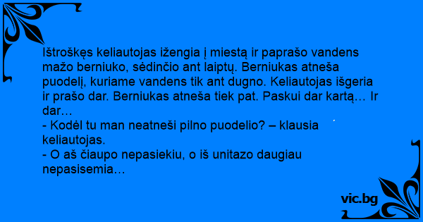 Ištroškęs keliautojas ižengia į miestą ir paprašo vandens mažo berniuko, sėdinčio ant laiptų. Berniukas atneša puodelį, kuriame vandens tik ant dugno. Keliautojas išgeria ir prašo dar. Berniukas atneša tiek pat. Paskui dar kartą… Ir dar…