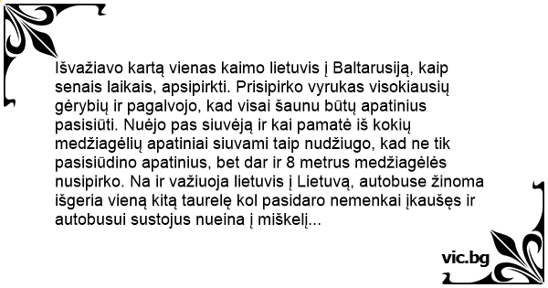 Išvažiavo kartą vienas kaimo lietuvis į Baltarusiją, kaip senais laikais, apsipirkti. Prisipirko vyrukas visokiausių gėrybių ir pagalvojo, kad visai šaunu būtų apatinius pasisiūti. Nuėjo pas siuvėją ir kai pamatė iš kokių medžiagėlių apatiniai siuvami taip nudžiugo, kad ne tik pasisiūdino apatinius, bet dar ir 8 metrus medžiagėlės nusipirko. Na ir važiuoja lietuvis į Lietuvą, autobuse žinoma išgeria vieną kitą taurelę kol pasidaro nemenkai įkaušęs ir autobusui sustojus nueina į miškelį nusišlapint. Vyrukas bijodamas sugadinti šauniuosius apatinius juos pasikabina ant šakelės ir juos ten pamiršta. Grįžta lietuvis namo, pasiilgęs žmonos tik įbėga pro namų duris, nusimeta visus drabužius ir rėkia: „Žmona, žiūrėk ką turiu!“. Žmona pasižiūri, nurausta ir pasako: „Kaip gražu, vyreli!“. Vyras sako: „Tai čia dar nieko, krepšy dar 8 metrus turiu!“.