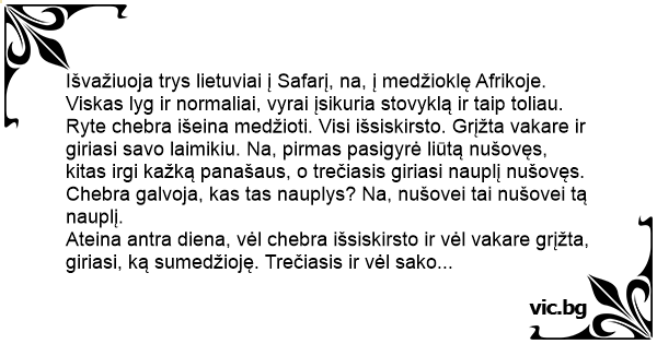 Išvažiuoja trys lietuviai į Safarį, na, į medžioklę Afrikoje. Viskas lyg ir normaliai, vyrai įsikuria stovyklą ir taip toliau. Ryte chebra išeina medžioti. Visi išsiskirsto. Grįžta vakare ir giriasi savo laimikiu. Na, pirmas pasigyrė liūtą nušovęs, kitas irgi kažką panašaus, o trečiasis giriasi nauplį nušovęs. Chebra galvoja, kas tas nauplys? Na, nušovei tai nušovei tą nauplį.