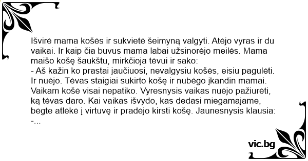 Išvirė mama košės ir sukvietė šeimyną valgyti. Atėjo vyras ir du vaikai. Ir kaip čia buvus mama labai užsinorėjo meilės. Mama maišo košę šaukštu, mirkčioja tėvui ir sako:
