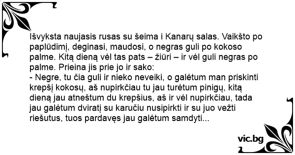 Išvyksta naujasis rusas su šeima i Kanarų salas. Vaikšto po paplūdimį, deginasi, maudosi, o negras guli po kokoso palme. Kitą dieną vėl tas pats – žiūri – ir vėl guli negras po palme. Prieina jis prie jo ir sako: