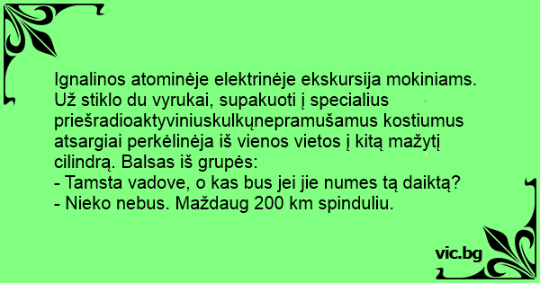 Ignalinos atominėje elektrinėje ekskursija mokiniams. Už stiklo du vyrukai, supakuoti į specialius priešradioaktyviniuskulkųnepramušamus kostiumus atsargiai perkėlinėja iš vienos vietos į kitą mažytį cilindrą. Balsas iš grupės: