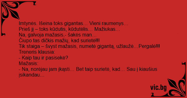 - Na, norėjau jam įkąsti… Bet taip surietė, kad… Sau į kiaušius įsikandau…