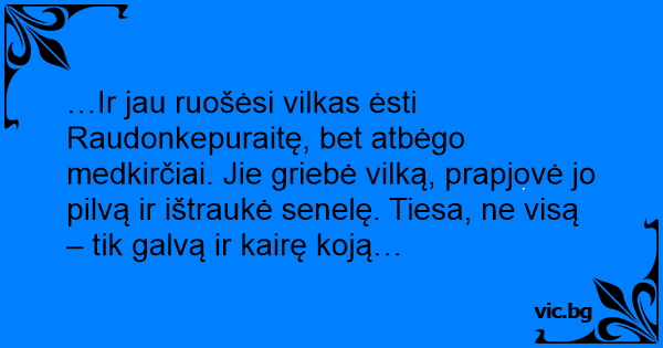…Ir jau ruošėsi vilkas ėsti Raudonkepuraitę, bet atbėgo medkirčiai. Jie griebė vilką, prapjovė jo pilvą ir ištraukė senelę. Tiesa, ne visą – tik galvą ir kairę koją…