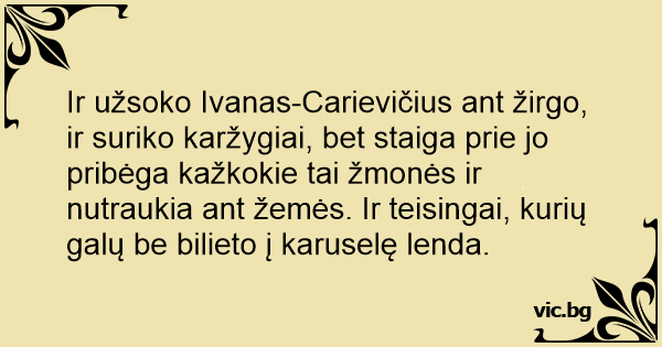 Ir užsoko Ivanas-Carievičius ant žirgo, ir suriko karžygiai, bet staiga prie jo pribėga kažkokie tai žmonės ir nutraukia ant žemės. Ir teisingai, kurių galų be bilieto į karuselę lenda.