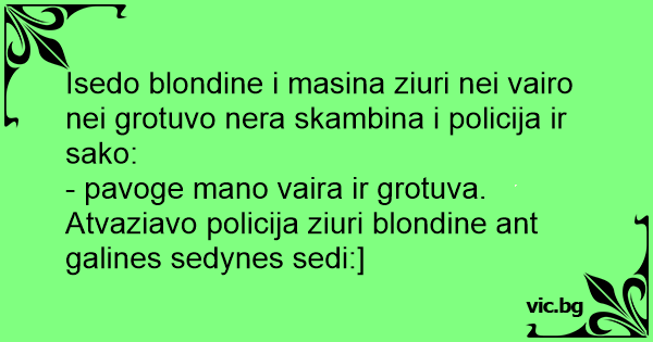 Isedo blondine i masina ziuri nei vairo nei grotuvo nera skambina i policija ir sako: - pavoge mano vaira ir grotuva. Atvaziavo policija ziuri blondine ant galines sedynes sedi:]