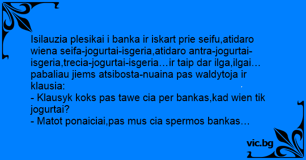Isilauzia plesikai i banka ir iskart prie seifu,atidaro wiena seifa-jogurtai-isgeria,atidaro antra-jogurtai-isgeria,trecia-jogurtai-isgeria…ir taip dar ilga,ilgai…pabaliau jiems atsibosta-nuaina pas waldytoja ir klausia: