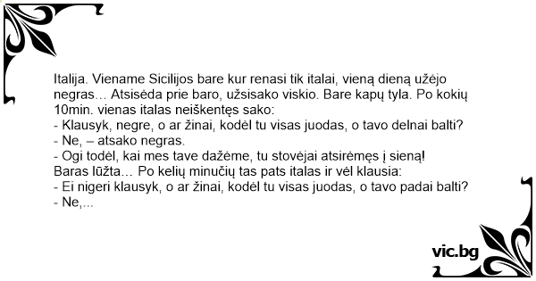 Italija. Viename Sicilijos bare kur renasi tik italai, vieną dieną užėjo negras… Atsisėda prie baro, užsisako viskio. Bare kapų tyla. Po kokių 10min. vienas italas neiškentęs sako: