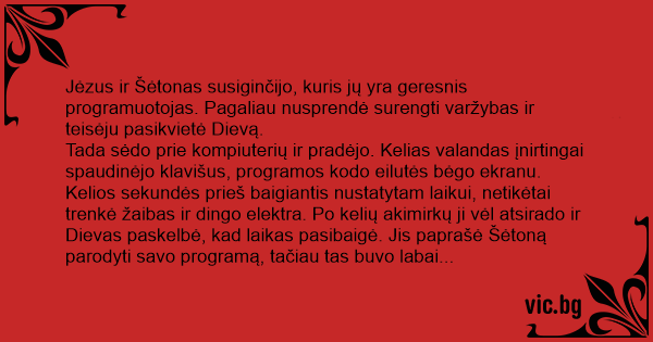 Jėzus ir Šėtonas susiginčijo, kuris jų yra geresnis programuotojas. Pagaliau nusprendė surengti varžybas ir teisėju pasikvietė Dievą.