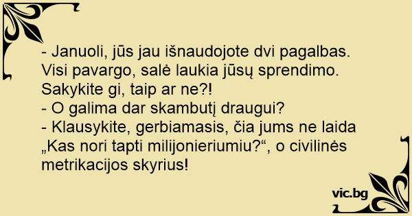 - Klausykite, gerbiamasis, čia jums ne laida „Kas nori tapti milijonieriumiu?“, o civilinės metrikacijos skyrius!
