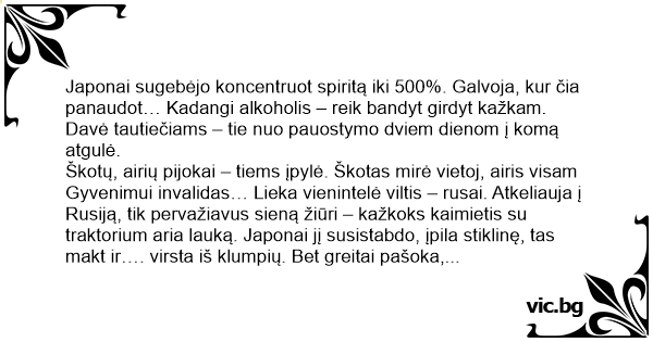 Japonai sugebėjo koncentruot spiritą iki 500%. Galvoja, kur čia panaudot… Kadangi alkoholis – reik bandyt girdyt kažkam. Davė tautiečiams – tie nuo pauostymo dviem dienom į komą atgulė.