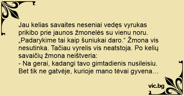 Jau kelias savaites neseniai vedęs vyrukas prikibo prie jaunos žmonelės su vienu noru. „Padarykime tai kaip šuniukai daro.“ Žmona vis nesutinka. Tačiau vyrelis vis neatstoja. Po kelių savaičių žmona neištveria: