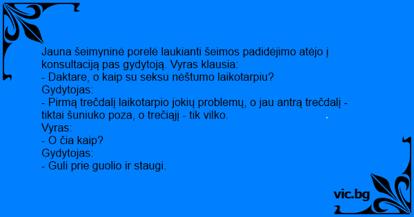 Jauna šeimyninė porelė laukianti šeimos padidėjimo atėjo į konsultaciją pas gydytoją. Vyras klausia: