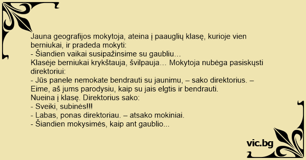 - Jūs panele nemokate bendrauti su jaunimu, – sako direktorius. – Eime, aš jums parodysiu, kaip su jais elgtis ir bendrauti.