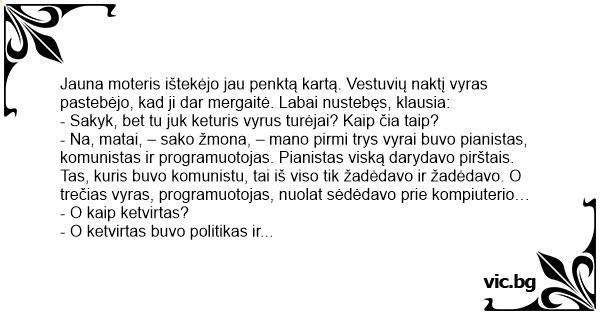 - Na, matai, – sako žmona, – mano pirmi trys vyrai buvo pianistas, komunistas ir programuotojas. Pianistas viską darydavo pirštais. Tas, kuris buvo komunistu, tai iš viso tik žadėdavo ir žadėdavo. O trečias vyras, programuotojas, nuolat sėdėdavo prie kompiuterio…