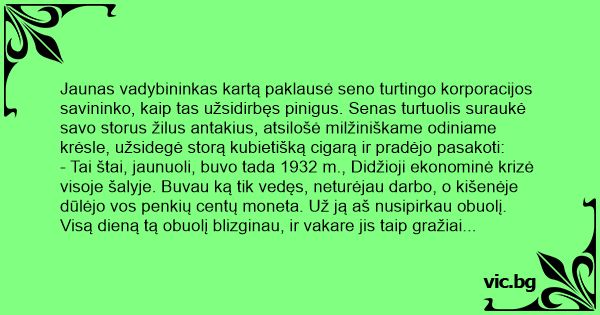 Jaunas vadybininkas kartą paklausė seno turtingo korporacijos savininko, kaip tas užsidirbęs pinigus. Senas turtuolis suraukė savo storus žilus antakius, atsilošė milžiniškame odiniame krėsle, užsidegė storą kubietišką cigarą ir pradėjo pasakoti: