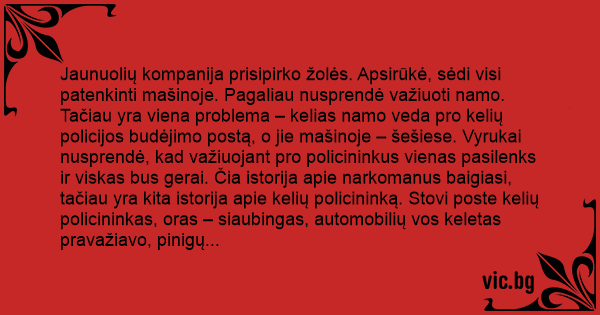 Jaunuolių kompanija prisipirko žolės. Apsirūkė, sėdi visi patenkinti mašinoje. Pagaliau nusprendė važiuoti namo. Tačiau yra viena problema – kelias namo veda pro kelių policijos budėjimo postą, o jie mašinoje – šešiese. Vyrukai nusprendė, kad važiuojant pro policininkus vienas pasilenks ir viskas bus gerai. Čia istorija apie narkomanus baigiasi, tačiau yra kita istorija apie kelių policininką. Stovi poste kelių policininkas, oras – siaubingas, automobilių vos keletas pravažiavo, pinigų nesurenka, o čia dar staiga pravažiuoja mašina, o joje – nieko nėra!