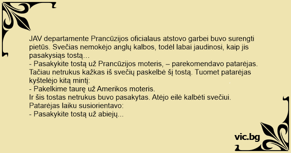 JAV departamente Prancūzijos oficialaus atstovo garbei buvo surengti pietūs. Svečias nemokėjo anglų kalbos, todėl labai jaudinosi, kaip jis pasakysiąs tostą…