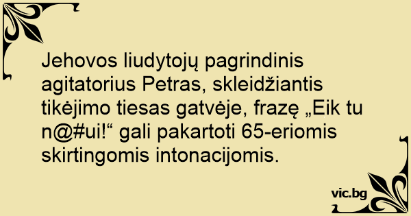 Jehovos liudytojų pagrindinis agitatorius Petras, skleidžiantis tikėjimo tiesas gatvėje, frazę „Eik tu n@#ui!“ gali pakartoti 65-eriomis skirtingomis intonacijomis.