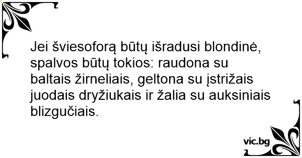 Jei šviesoforą būtų išradusi blondinė, spalvos būtų tokios: raudona su baltais žirneliais, geltona su įstrižais juodais dryžiukais ir žalia su auksiniais blizgučiais.