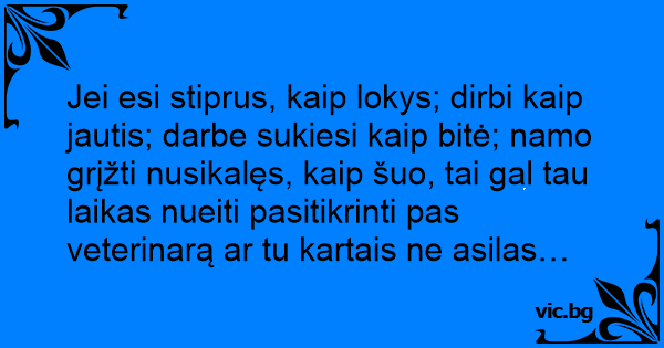Jei esi stiprus, kaip lokys; dirbi kaip jautis; darbe sukiesi kaip bitė; namo grįžti nusikalęs, kaip šuo, tai gal tau laikas nueiti pasitikrinti pas veterinarą ar tu kartais ne asilas…