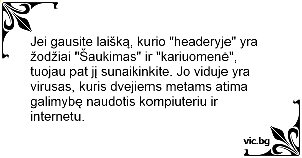 Jei gausite laišką, kurio "headeryje" yra žodžiai "Šaukimas" ir "kariuomenė", tuojau pat jį sunaikinkite. Jo viduje yra virusas, kuris dvejiems metams atima galimybę naudotis kompiuteriu ir internetu.