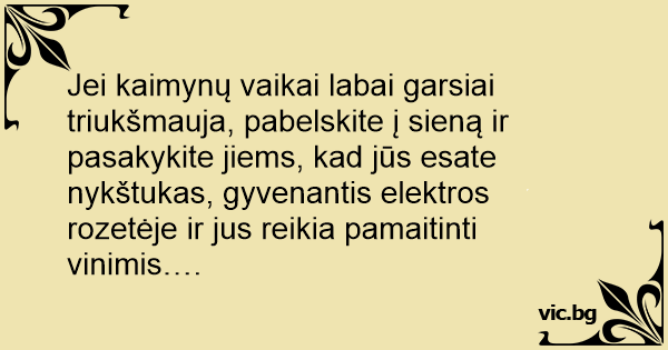 Jei kaimynų vaikai labai garsiai triukšmauja, pabelskite į sieną ir pasakykite jiems, kad jūs esate nykštukas, gyvenantis elektros rozetėje ir jus reikia pamaitinti vinimis….