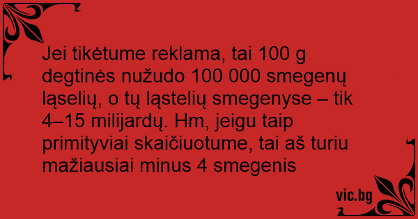 Jei tikėtume reklama, tai 100 g degtinės nužudo 100 000 smegenų ląselių, o tų ląstelių smegenyse – tik 4–15 milijardų. Hm, jeigu taip primityviai skaičiuotume, tai aš turiu mažiausiai minus 4 smegenis