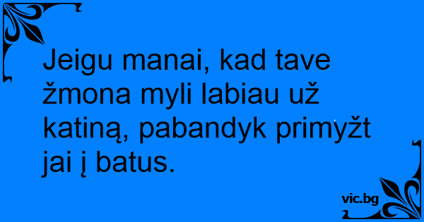 Jeigu manai, kad tave žmona myli labiau už katiną, pabandyk primyžt jai į batus.