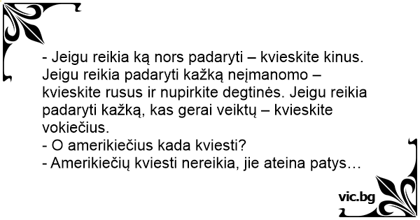 - Jeigu reikia ką nors padaryti – kvieskite kinus. Jeigu reikia padaryti kažką neįmanomo – kvieskite rusus ir nupirkite degtinės. Jeigu reikia padaryti kažką, kas gerai veiktų – kvieskite vokiečius.