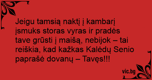 Jeigu tamsią naktį į kambarį įsmuks storas vyras ir pradės tave grūsti į maišą, nebijok – tai reiškia, kad kažkas Kalėdų Senio paprašė dovanų – Tavęs!!!