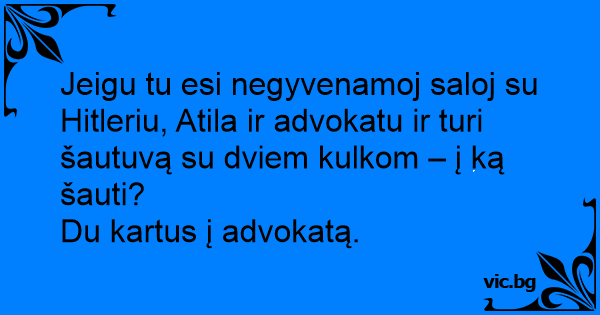 Jeigu tu esi negyvenamoj saloj su Hitleriu, Atila ir advokatu ir turi šautuvą su dviem kulkom – į ką šauti?