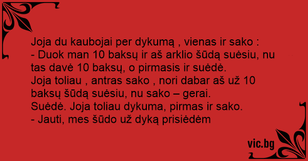 - Duok man 10 baksų ir aš arklio šūdą suėsiu, nu tas davė 10 baksų, o pirmasis ir suėdė.