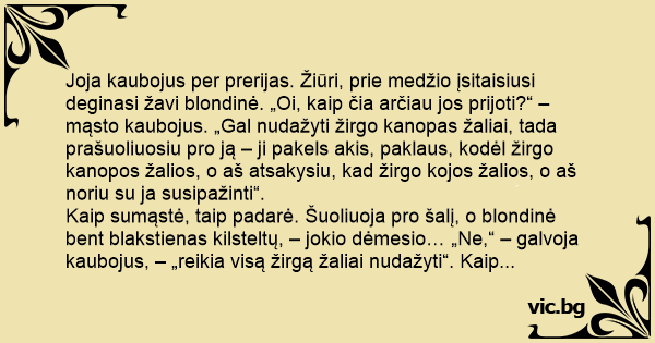 Kaip sumąstė, taip padarė. Šuoliuoja pro šalį, o blondinė веnт blakstienas kilsteltų, – jokio dėmesio… „Ne,“ – galvoja kaubojus, – „reikia visą žirgą žaliai nudažyti“. Kaip mąstė, – taip padarė. Bet vėl nė trupučiuko dėmesio..